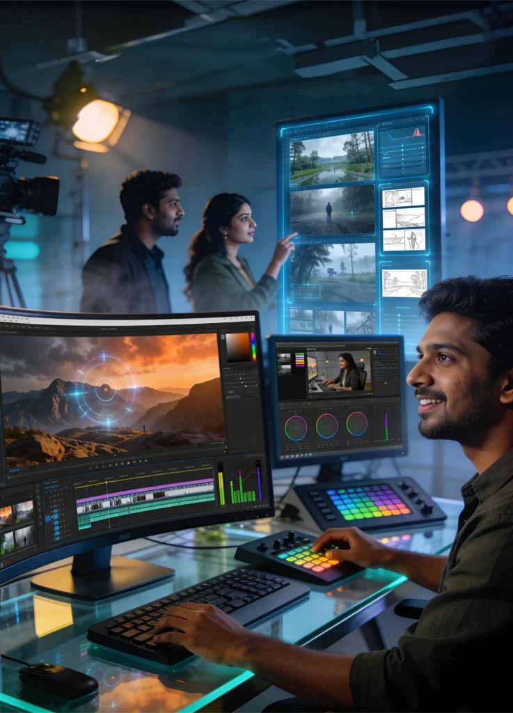 Students learn cinematic editing techniques, AI-assisted workflows, color grading, motion graphics, and visual storytelling.